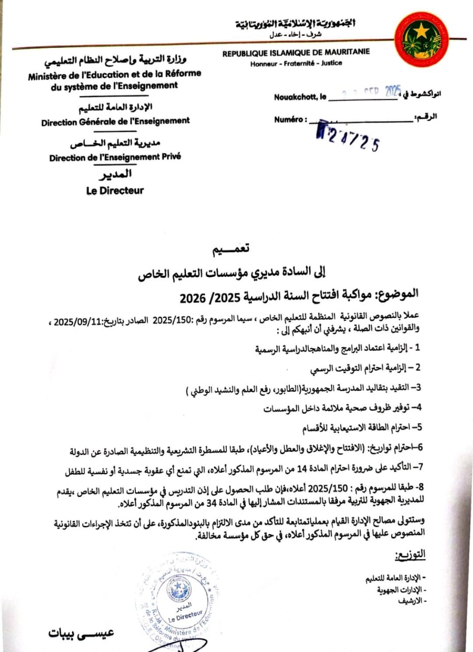 كما ألزمت الوزارة في تعميم موجه إلى مديري مؤسسات التعليم الخاص، باحترام التوقيت الرسمي، وتوفير ظروف صحية ملائمة داخل المؤسسات، واحترام الطاقة الاستيعابية للأقسام.