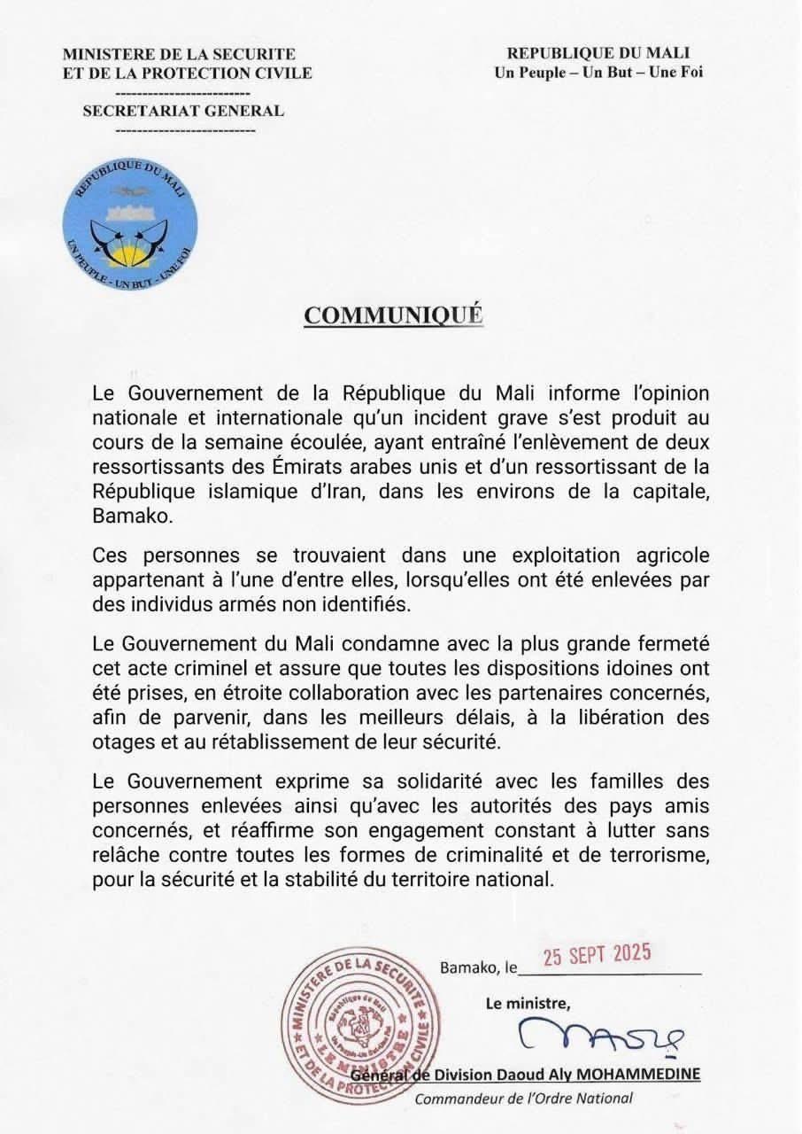 تم الإعلان رسميا من طرف السلطات المالية زوال اليوم الخميس الموافق 25 سبتمبر 2025 , عن تأكيد ماتم تداوله منذ عصر امس الاربعاء من تمكن إرهابين من اختطاف ثلاث اجانب تبين لاحقا انهم :