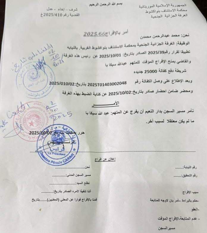 أفرج القضاء الموريتاني زوال اليوم الخميس 02 اكتوبر 2025 , عن مسؤول الهجرة في حركة إيرا عبدالله با , بحرية مؤقته بعد دفعه مبلغ 250 ألف لحزينة الدولة في انتزار مثوله أمام قاضيه الطبيعي من اجل الخضوع للمحاكمة . مع ضرورة تعهد ضامن إحضار به .