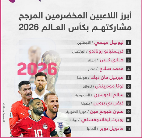 وفيما يلي إنفوغراف بأبرز اللاعبين المرجح مشاركتهم مع منتخباتهم في نهائيات كأس العالم القادمة.