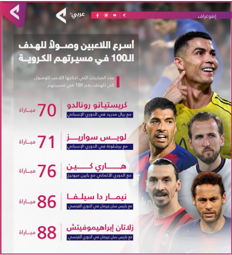 وفيما يلي إنفوغراف بأسرع اللاعبين وصولاً للهدف رقم 100 في مسيرتهم الكروية: