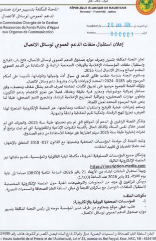 اللجنة وفي بيان نشرته أكدت أنها ستقوم بدراسة ملفات طالبي الدعم في سياق أداء واجباتها والتزاماتها، تأسيسا على أحكام المرسوم رقم: 0185- 2024؛ المحدد لإجراءات وآليات وشروط دعم وسائل الاتصال