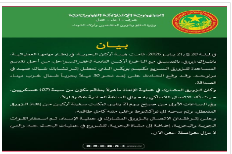 أعلنت وزارة الدفاع الموريتانية فقدان الاتصال بزورق عسكري كان على متنه 7 عسكريين، مؤكدا أن عمليات البحث الجوي والبري والبحري المكثفة لا تزال متواصلة للعثور عليه.