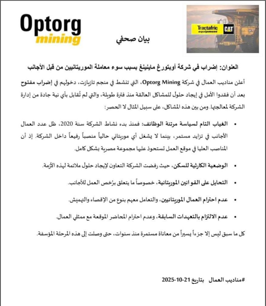 الإعلان عن إضراب في شركة أوبتورغ ماينينغ بسبب سوء معاملة الموريتانيين من قبل الأجانب
