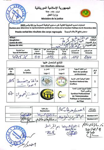 وقد حققت النقابة الوطنية لكتاب الضبط، المنضوية تحت لواء اتحاد العمال الموريتانيين (UTM)، فوزًا كاسحًا بحصولها على 105 أصوات، مقابل 7 أصوات فقط لمنافستها.